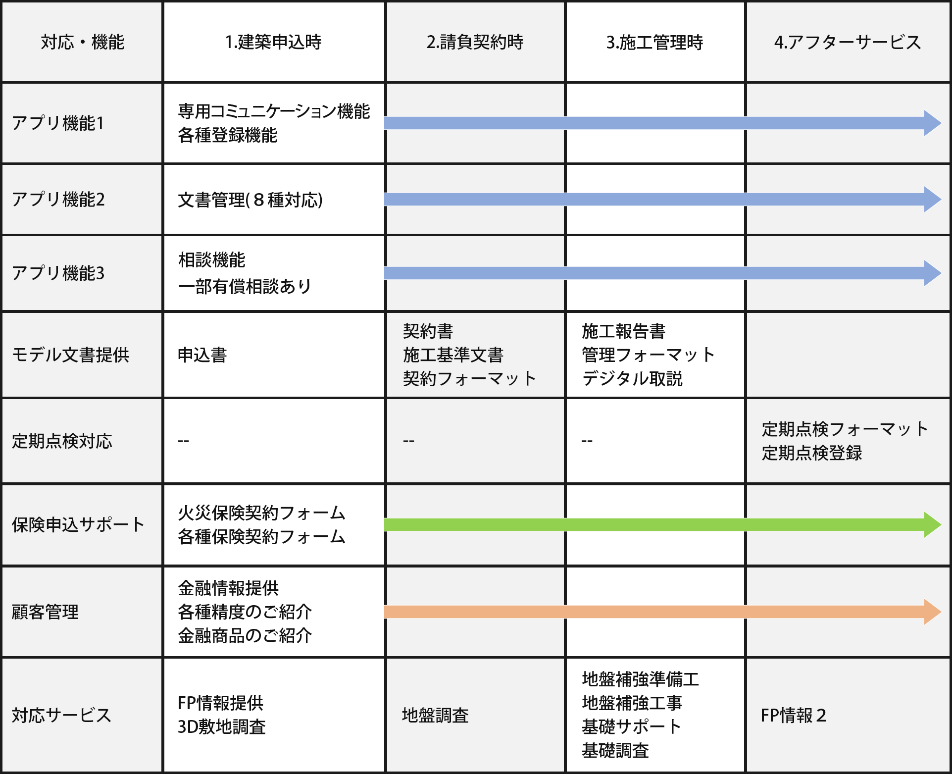 | 対応サービス | ① FP相談時の有償対応(有償の場合は事前にご説明) ② 躯体オペレーションシステム対応地域での対応サービス |